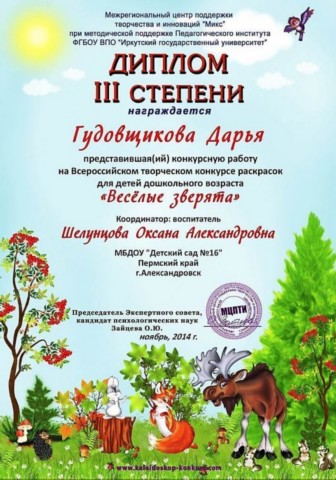 Призеры Всероссийского творческого конкурса раскрасок для детей дошкольного возраста "Веселые зверята" |